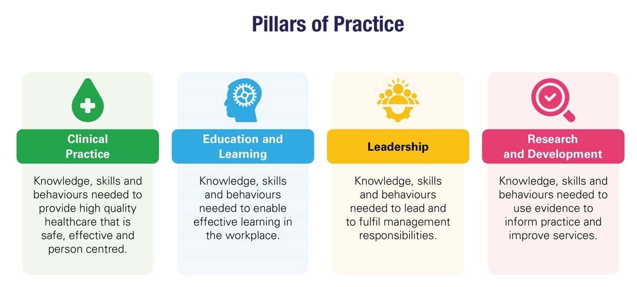 These levels are also linked to 4 interconnected Pillars of Practice which outline the breadth and range of knowledge, skills and behaviours required to practise safely and effectively across the wide variety of roles and settings. The knowledge, skills and behaviours statements are presented in the Diagram (with a full description in the accordian) below, also available in pdf format here.